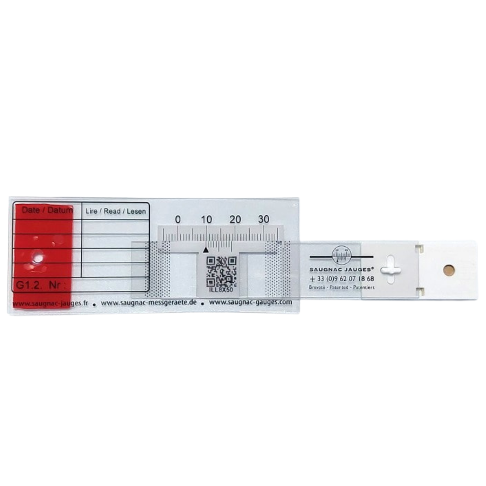 Die G1.2-Riss-Messlehre ist identisch mit der G1-Riss-Messlehre, jedoch transparent, um sie auf hochwertigen Untergründen (gepflegte Innenräume, Steinfassaden, …) anzubringen. Sie ist witterungsbeständig.